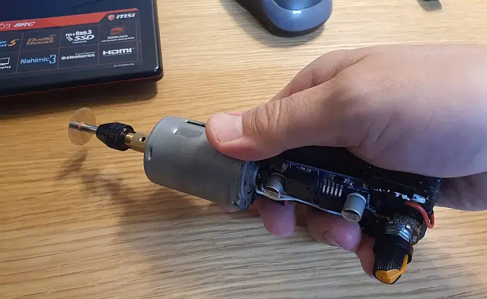 아래쪽의 가변 저항을 돌려주면 모터의 속도가 변합니다. 전압이 조금 부족하여 완전 초고속은 아니지만 그만큼 안전하게 오랜 시간을 사용할 수 있을 것이라 생각해 봅니다.