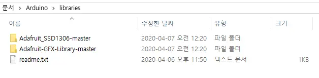 받은신 라이브러리는 압축을 해제하여 내문서> Arduino> Library 폴더안에 아래와 같이 복사해서 넣어주세요.
