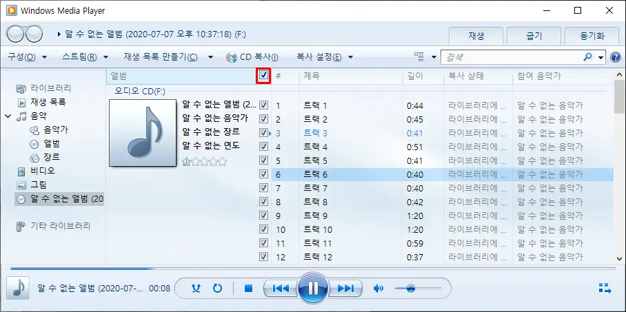 아래 그림의 빨간 네모 박스를 선택하셔서 내 컴퓨터로 가져올 음악을 모두 선택해 줍니다. 물론 개별로 선택하셔도 됩니다.