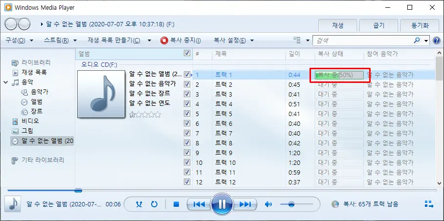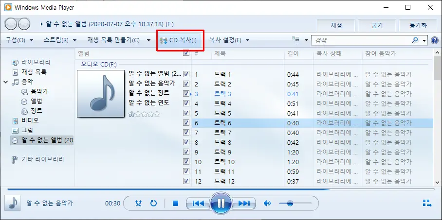 참고로 복사설정을 누르시면 복사할 파일의 음질이나 포멧 등에 대하여 선택이 가능하므로 원하는 설정을 먼저 골라준 뒤 복사를 진행해도 되지만 이것저것 잘 모르겠으면 그냥 CD 복사 를 하셔도 무방합니다.