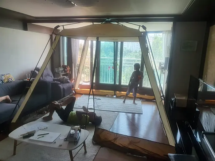 모기장의 크기가 생각보다 크네요. 실내에 설치해보니 그 크기가 실감이 됩니다. 32평 아파트 거실만하군요.