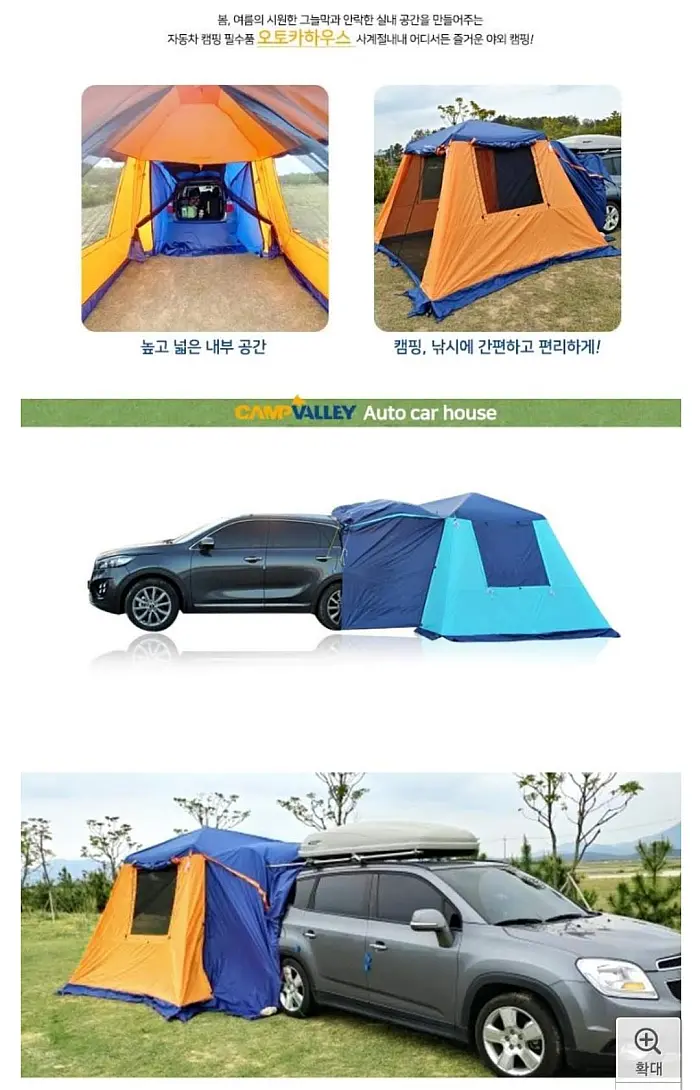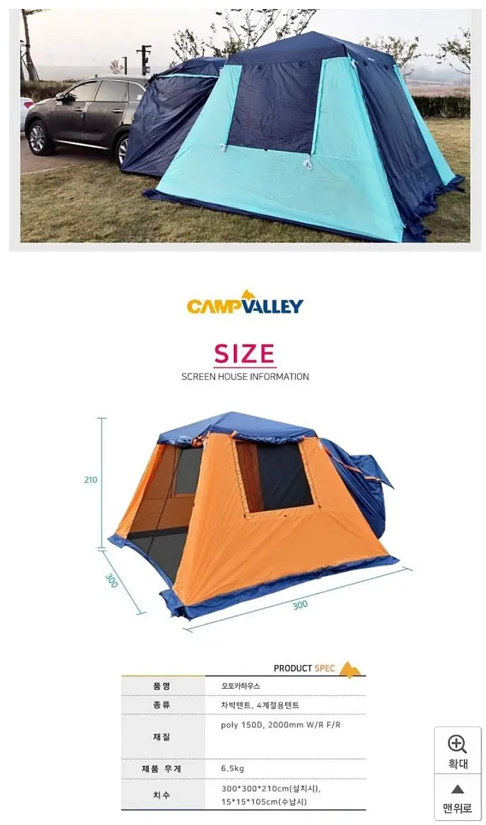 바로 인터넷 쇼핑몰을 둘러보며 이런저런 제품들을 찾아보던 중 캠프밸리에서 출시한 차박 캠핑용 텐트인 "오토카하우스 차박텐트"를 구입하였습니다. 가격이 저렴한 편 (235,000원) 이어서 저와 같은 입문용으로 적당해 보였고 천정이 높은 것 (무려 210cm) 이 마음에 들었으며 차량 연결 부위가 충분히 커서 나중에 차량을 변경하게 되더라도 무난히 사용할 수 있을 거라 판단 되었고요. 무엇보다 원터치로 모기장 텐트를 펼수 있다는 점에 높은 점수를 주었습니다. 캠핑장에서 텐트치다보면 한나절인 분들 계시잖아요? 저는 손재주는 좋은 편이지만 그런 귀찮은 과정을 마주하기는 싫었기 때문에 설치가 편리한 제품을 우선으로 하였습니다.