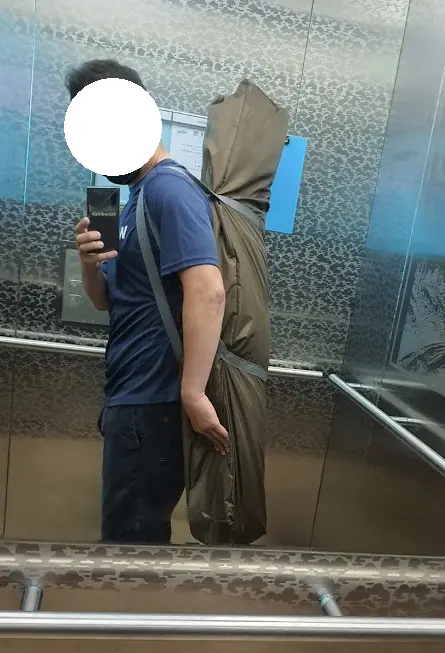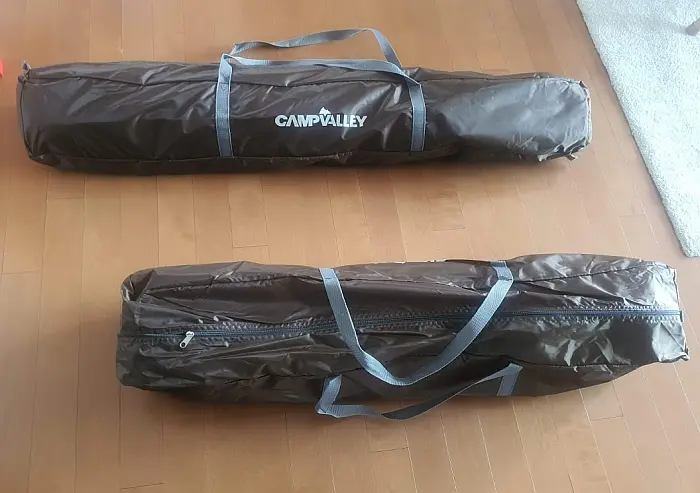 펼쳐보니 긴 가방은 안쪽에 설치하는 기둥 역할을 하는 모기장 텐트이고 짧은게 그 모기장 텐트를 덮는 텐트 외부 천 이었습니다.