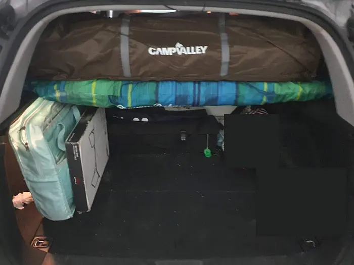 트렁크 양쪽 창문 부분 옆으로 슬라이드 덮개를 끼는 레일이 있는데 그 레일위에 얹으니 딱 맞더구요. 길이가 더 긴 모기장 텐트는 트렁크 창문쪽에 끼우면 적당하게 잘 맞습니다. 아래 보이는 코스트코 파라솔이 외부 텐트를 받쳐주고 있습니다.
