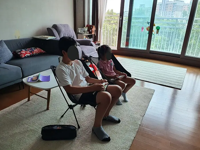 아이들이 앉으면 이런 모습입니다. ㅋ 앙증맞네요. 아래 쪽에 보이는 가방이 바로 수납 가방입니다. 정말 작죠? 실내화 가방만하네요.