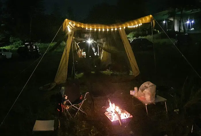 그나마 풀들이 조금 적게 난 곳을 이용해서 텐트를 치고 의자와 테이블, 야심차게 준비한 가랜드 조명도 설치했습니다.