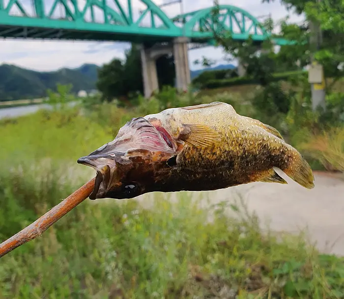 덜마른 나뭇가지를 주워 껍질을 대충 벗기고 꺽지의 커다란 입속으로 끼워 넣었습니다.