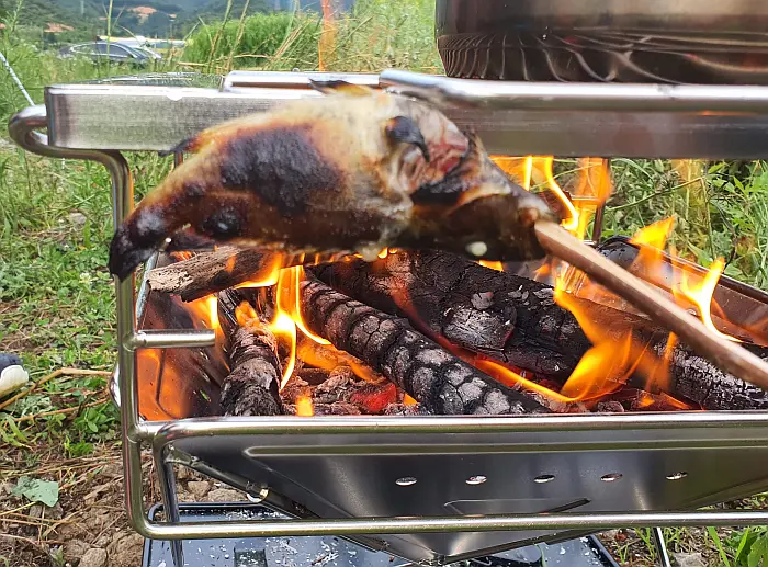 그리고 정글의 법칙의 병만족장 처럼 불 옆에 세워 굽기 시작했습니다.