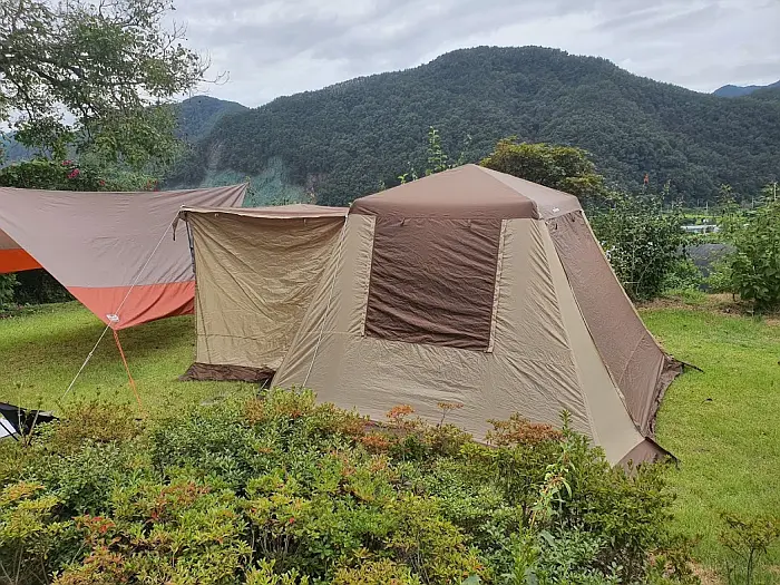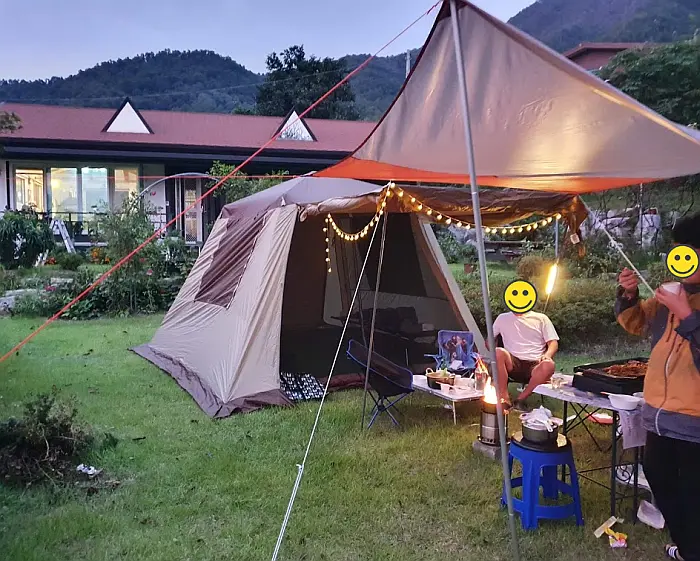 마당 한가운데 텐트와 타프를 치고 테이블도 세팅을 합니다.