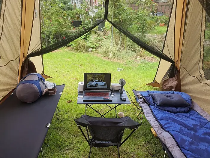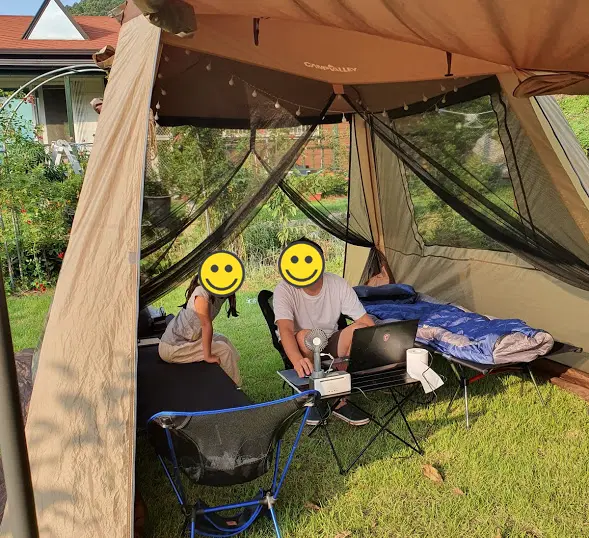낮에는 재택근무지만 밤에는 캠핑이므로 잠도 텐트에서 자기로 하였습니다. 텐트와 침대, 침낭까지 세팅을 합니다.