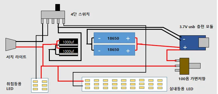 배터리 두개를 병렬로 연결 했으니 5000mA 가 넘은 용량이 됩니다. 하루 저녁쯤은 거뜬 할 것으로 예상합니다. 물론... 잘때는 취침등으로 어둡게 밝기를 낮추어 주어야 겠지만요.