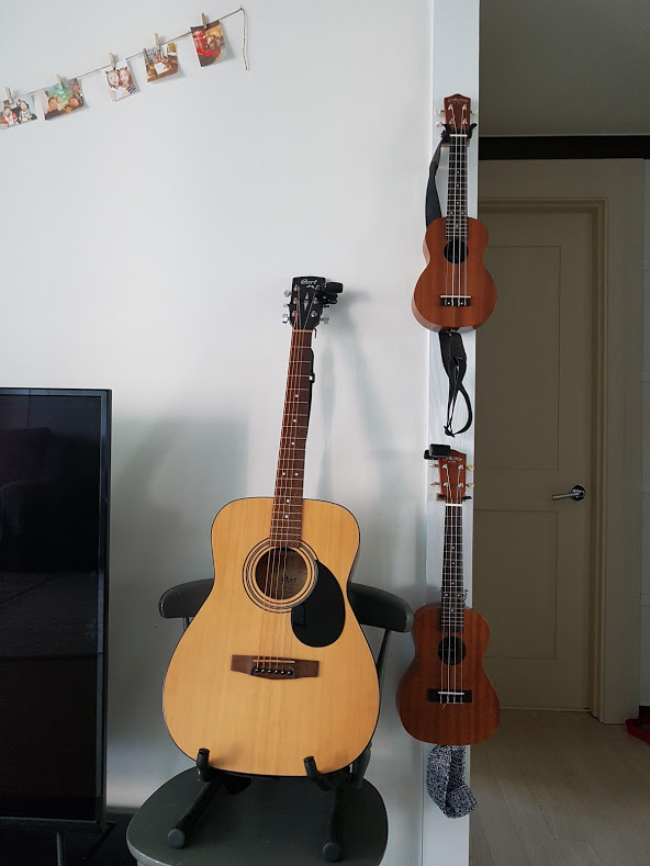 그리하여 기타1, 우쿨렐레 2가 적당한 공간에 보기좋게 위치할 수 있게 되었습니다.