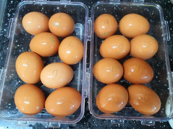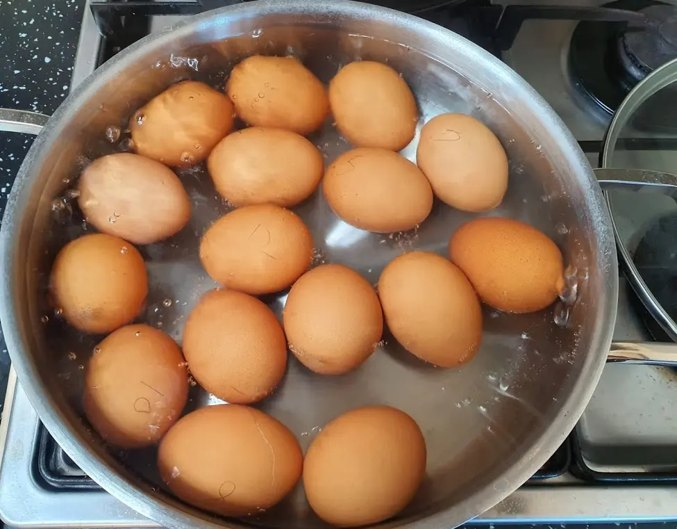그리고 저만의 노하우랄까요? ㅋㅋ 물이 끓는 동안 계란에 번호표를 붙여 줍니다. 그냥 연필로 쓱쓱 써주면 됩니다.
