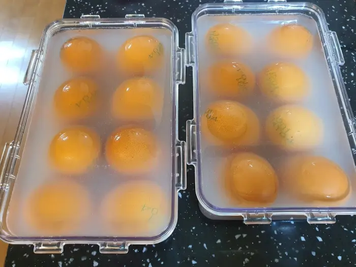 참고로 이 때 소금물을 버리지 말고 후숙을 해보고 싶으신분은 후숙을 해보셔도 좋을 것 같습니다. 확실히 소금물에 후숙하면 흰자가 짭짤해지긴 합니다. (약간이긴 하지만)