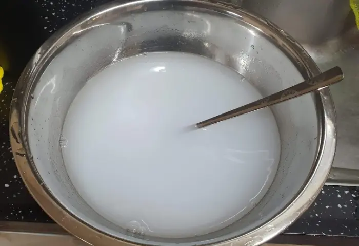 이제 이렇게 만들어진 소금물을 아까 준비했던 통에 부어 줍니다.