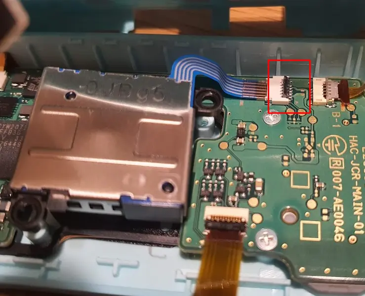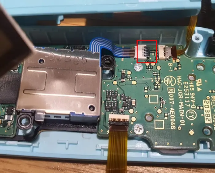 이런 류의 회로기판을 자주 안보신 분들은 생소하실 텐데요. 저 빨간 네모 부분의 검은 색 조각을 핀셋이나 뾰족한 도구를 이용하여 위로 들어올려주어야 리본 케이블이 빠집니다.