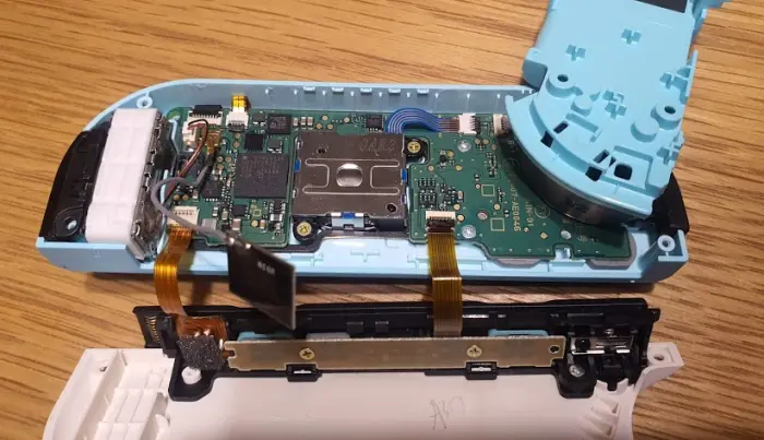 이제 가운데 파란색 배터리 케이스를 재껴내듯 뒤집어 줍니다. 리본 케이블이 살짝 타이트한 느낌이 있으니 부드럽게 안쪽으로 살짝 밀듯이 뒤집으면 뒤집힙니다.