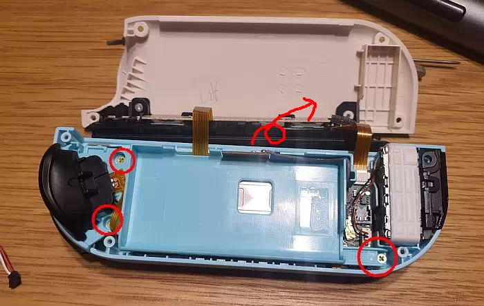 어쨌든 조이스틱에 연결되어 있는 두개의 나사를 풀어주면 조이스틱은 분리되는데 메인 보드에 연결 되어 있는 리본 케이블을 빼내에 합니다.