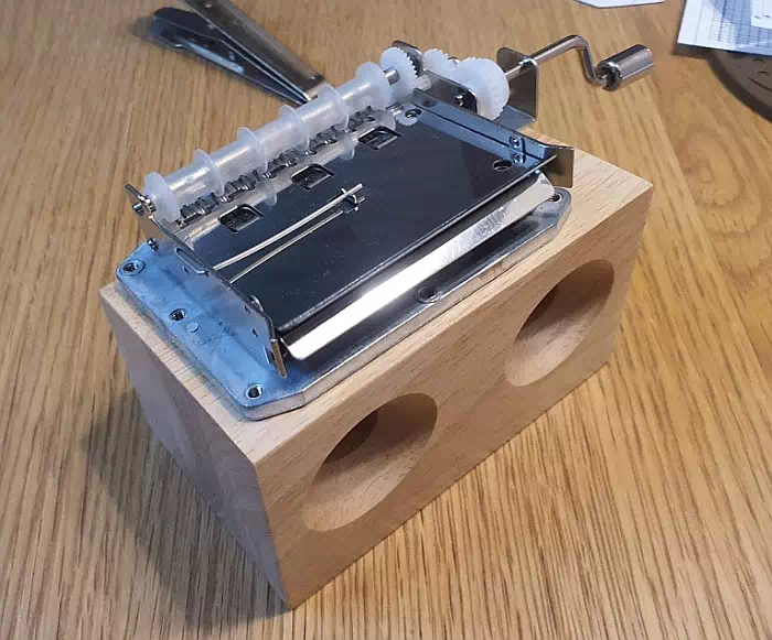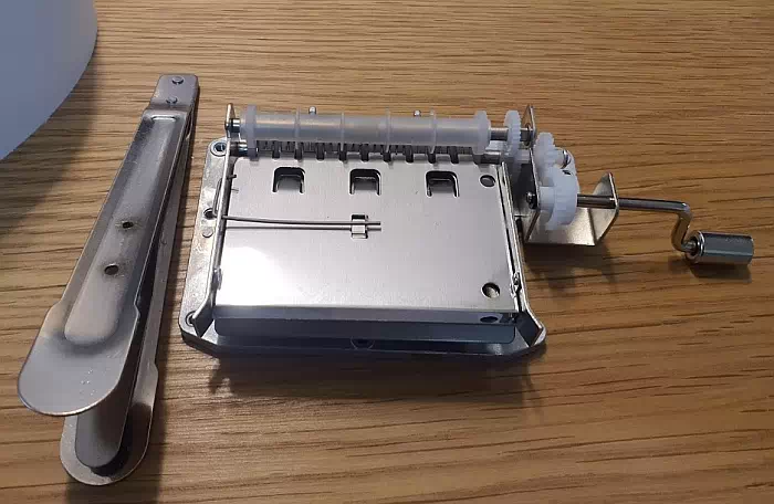 본체 우측의 손잡이를 돌리면 악보를 조금씩 움직이며 연주가 되는 형식입니다. 기존의 수동 오르골과 마찬가지로 돌리는 속도에 따라 음악 재생 속도가 달라집니다.