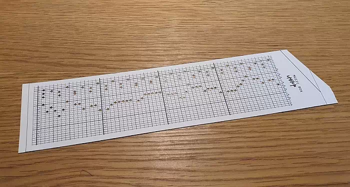 일단 휴대폰에 음의 높이를 측정할 수 있는 어플을 설치한 뒤 악보에 구멍을 순서대로 모두 뚫어서 음을 기록해 보았습니다.