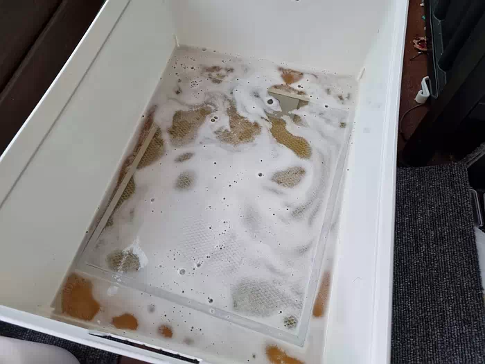 한 10분 정도 지났으려나요? 사진처럼 투명했던 물은 노랗게 변하고 거품이 무럭무럭 난 상태로 변화되었습니다. 통을 잡고 살살 흔들어 주면 남아있던 기름 때들이 녹아서 떨어지는 것을 볼 수 있는데요. 사실 검은 색으로 굳어버린 기름 때 덩어리가 아니라면 솔질도 한번 할 필요가 없이 싹 제거 됩니다.