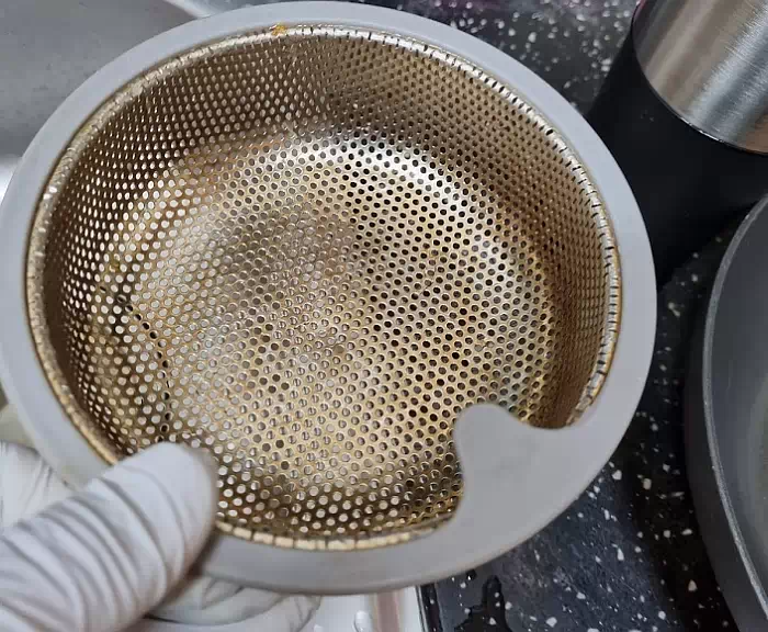 주방 하수구 거름망도 남은 용액을 이용해 닦아 봤습니다.