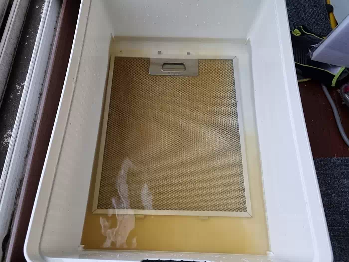 그 다음 통에 렌지후드가 잠길 만큼 물을 담아준뒤 수산화 나트륨을 3 스푼 정도 넣어 주고 스푼이나 막대로 잘 저어 줍니다. 이 때 반드시 손에는 니트릴 장갑이나 고무장갑을 착용하시기 바랍니다.