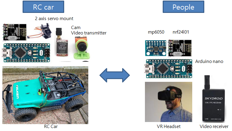 VR 헤드셋은 항상 제 머리에 부착되어 있는 상태로 머리의 회전각도를 구할 수 있을 것이고 이를 이용하여 아두이노에서 nrf24l01 과 같은 무선 송신기를 통하여 현재 제 머리의 방향을 송출하게 됩니다. 그럼 송출된 신호를 RC 카에 있는 아두이노와 nrf24l01 을 이용하여 수신한 뒤 수신한 각도를 이용하여 케메라를 부착하고 있는 서보 모터를 움직이는 것이죠.