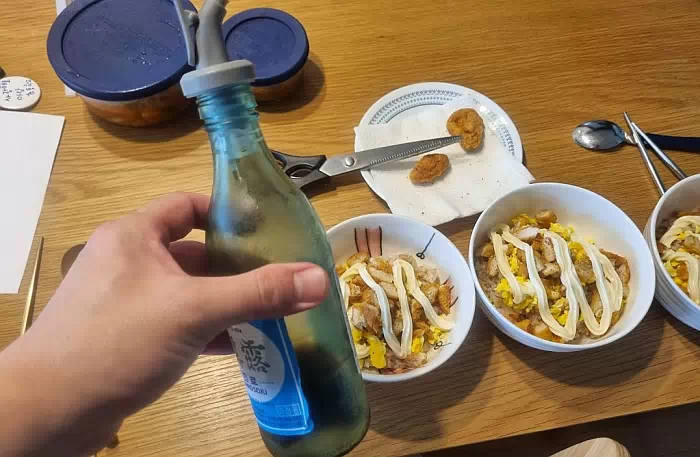 네... 소주 아닙니다. 데리야끼 소스가 뿌릴때 너무 팍 나와서 저렇게 소주병에 담아서 사용하고 있습니다.