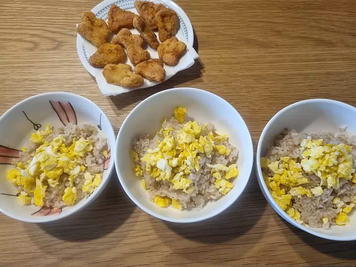 아빠는 공평한 사람이므로 정확히 3개씩 잘라 넣어 주었습니다. 밥보다 치킨이 더 많아 보이는 치킨마요 덮밥이 될거에요. 맛은 이미 보장입니다.