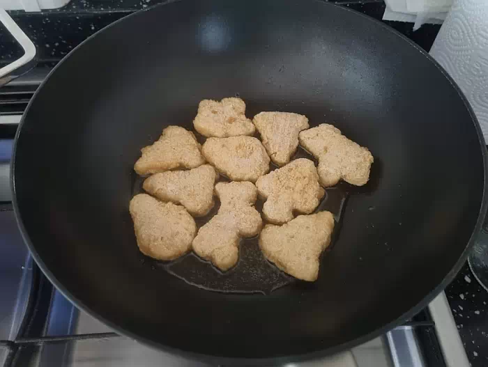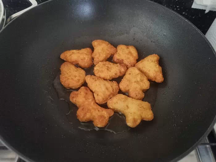 먼저 기름이 열이 조금 오르면 치킨 너겟을 대충 넣어 줍니다.