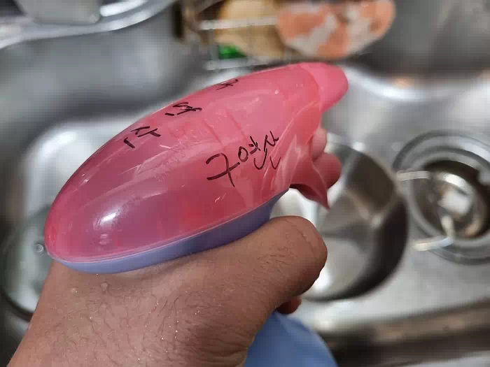 오븐 클리너는 피부에 닿으면 매우 좋지 않은 결과가 예상되므로 절대 피부에 닿지 않게 조심하면서 아까 사용했던 칫솔로 매직블럭을 지지해서 냄비를 닦기 시작합니다.