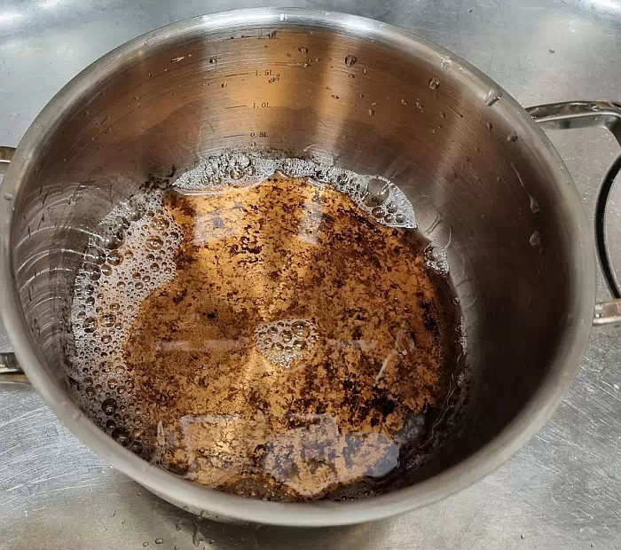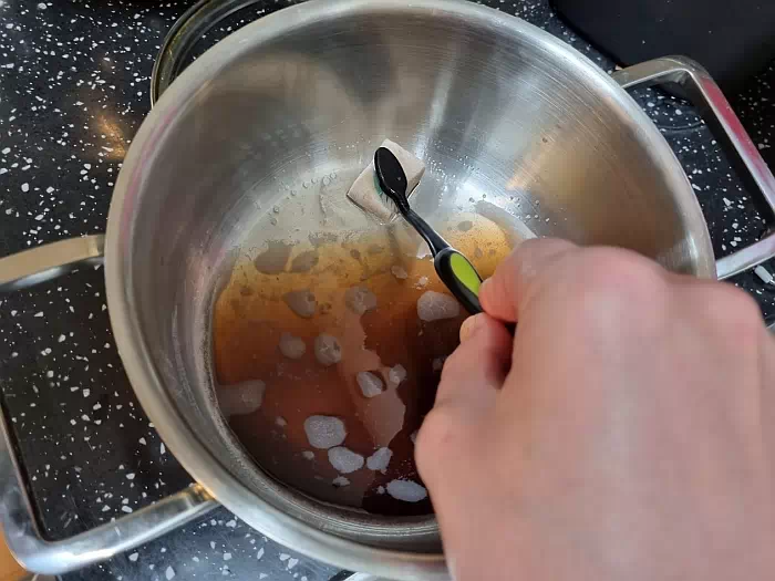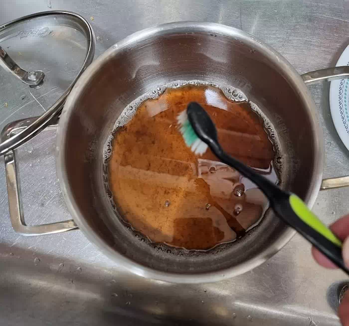 칫솔로 슬슬 문데주니 눌어 붙은 탄 자국들이 술술 지워지네요.