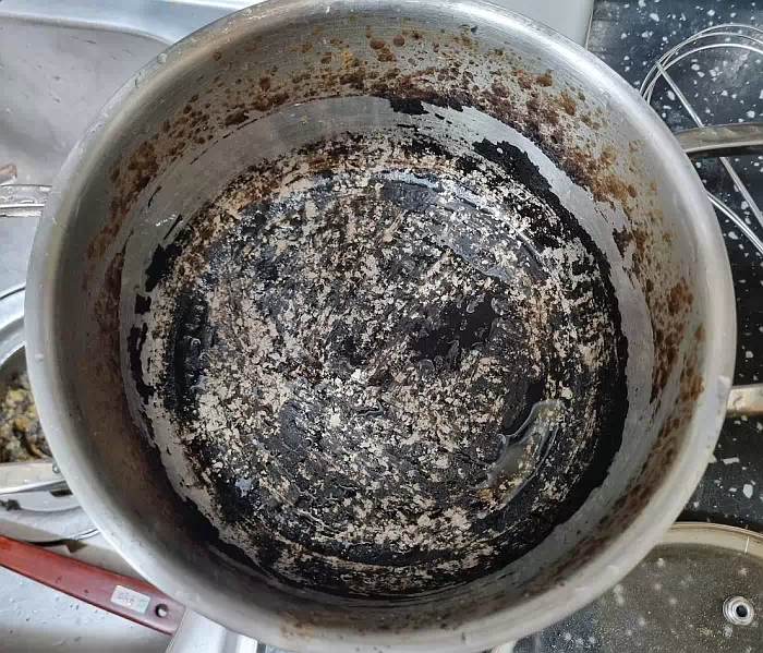 아무래도 잘 안닦이는 탄 흔적들이 남아있는 상태입니다. 보통 이정도에서 철 수세미를 꺼내들으시죠?