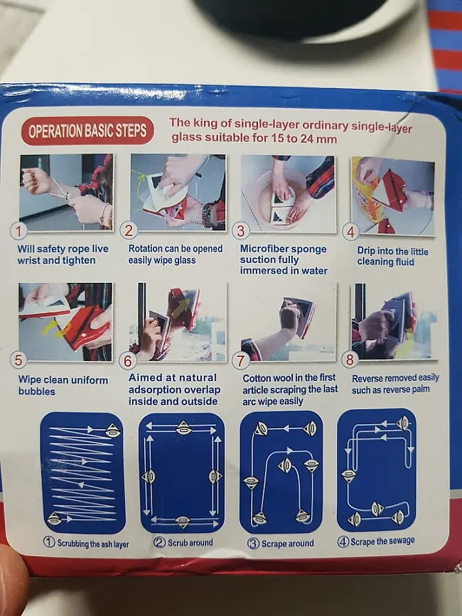 그런데 아래 1번 처럼 손목에 끈을 걸어서 바깥 부분이 아래로 추락하는 것을 방지하라고 되어 있는데 좋은 방법은 아니다. 끈이 아주 길지는 않기 때문에 우리집의 경우 유리창을 다 닦을 수 없었다. 아마 이 제품 개발한 분은 창문이 매우 작은 집에 살고 있는 듯하다. 우리 아파트가 큰것도 아닌데.