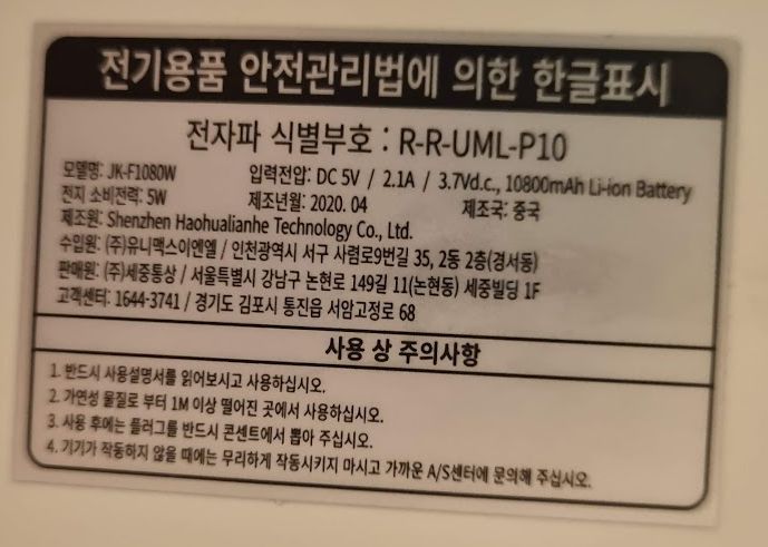 네, 제품명은 JK-F1080W 군요. 1080 하면 Full HD 가 떠오르는데.. 아마도 10800mAh 에서 따온듯 합니다. 뭔가 절묘하네요. ㅎㅎ