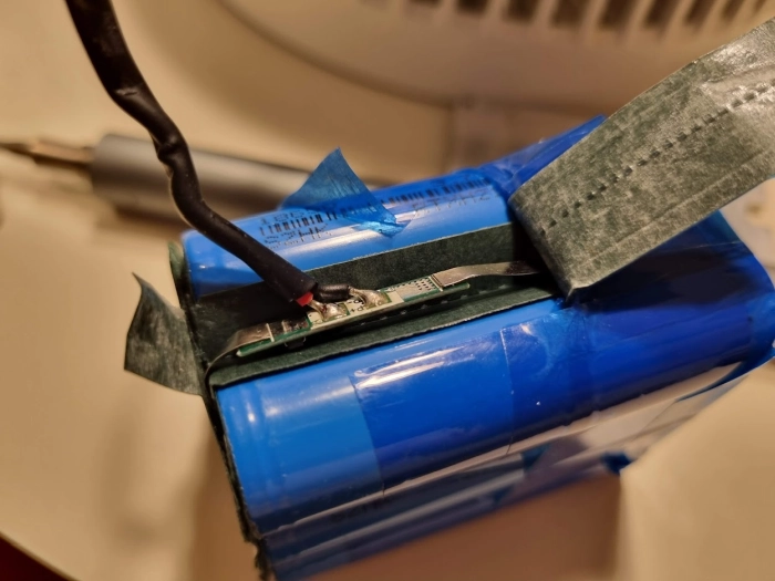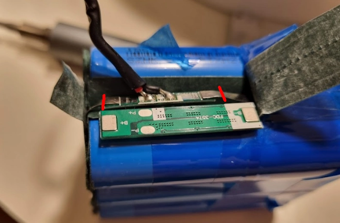 기존에 있던 보호회로를 조심조심 떼어냅니다. 기존 것보다 크기 때문에 기존 니켈라인을 조금 잘라냈습니다.