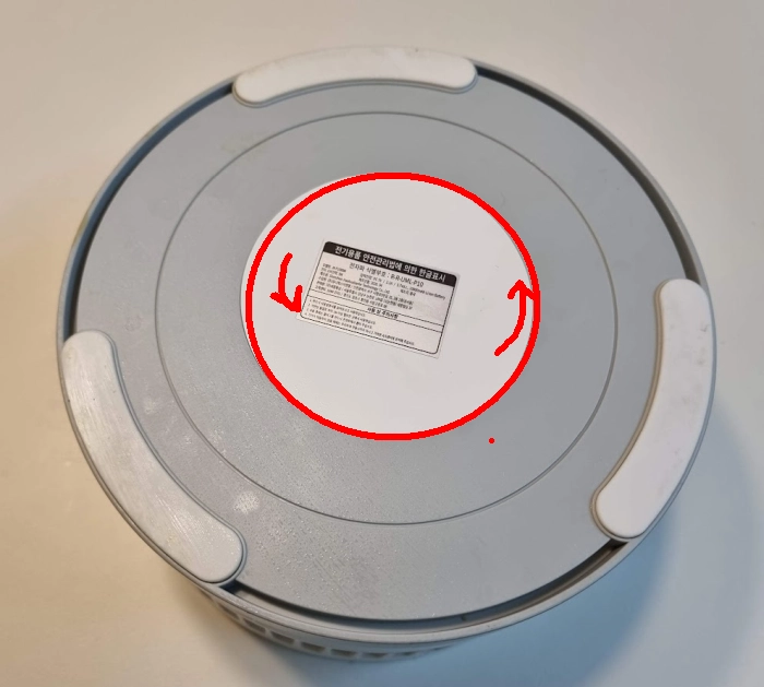뭔가 힌트라도 있었으면 좋았을 텐데 여는 방법을 몰라 알아내느라 고생 좀 했습니다. 양손을 선풍기 바깥을 잡고 양손 엄지 손가락을 하얀 부분에 데고 힘을 주어 누르면서 화살표 방향으로 돌리면 10도 정도 돌아가는데요. 그러면 하얀 부분이 열립니다.