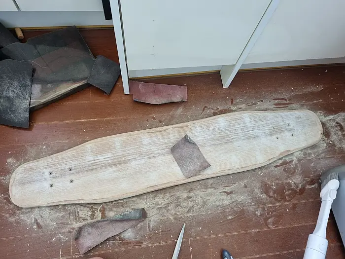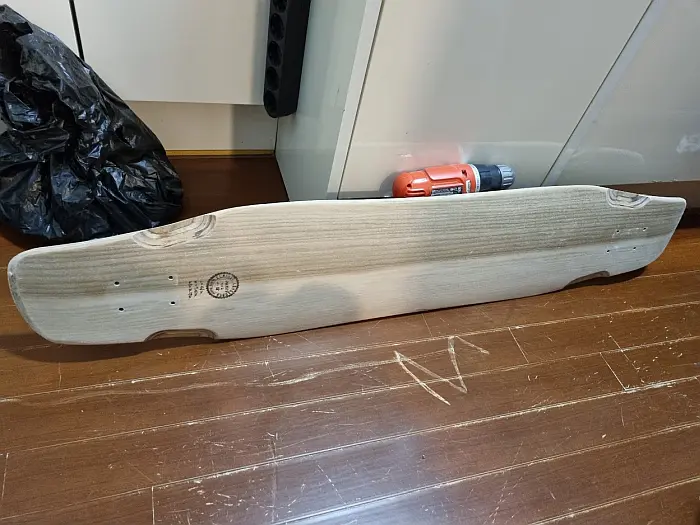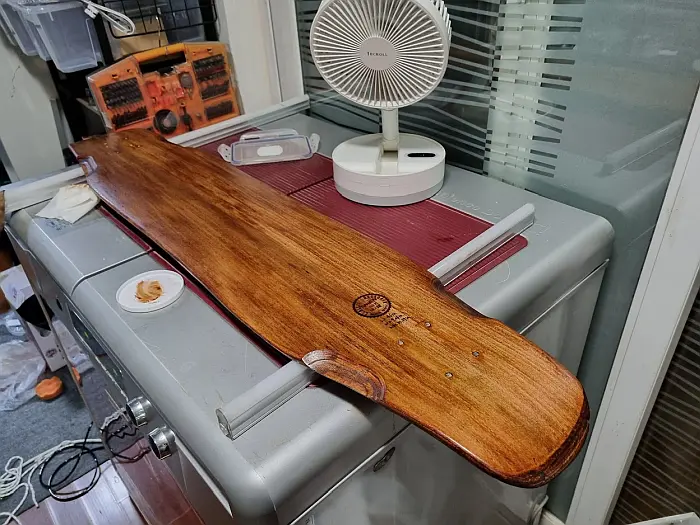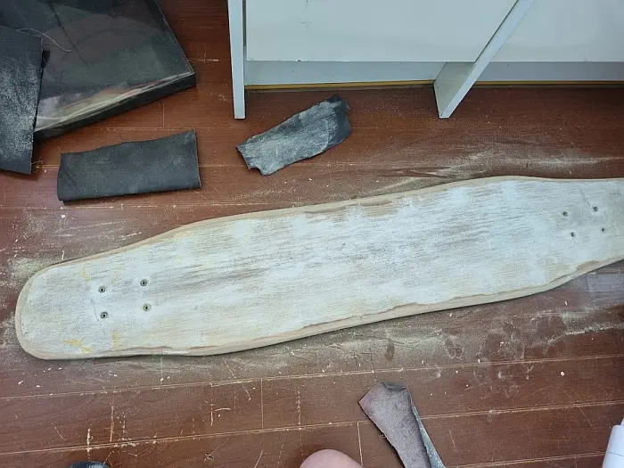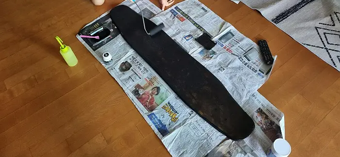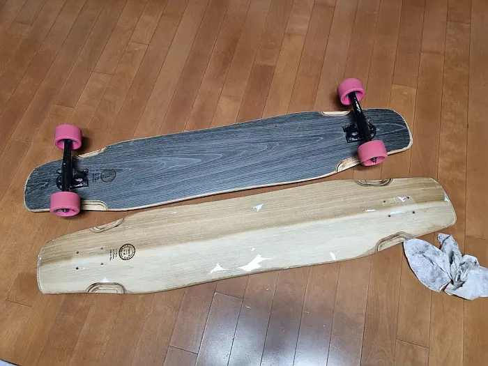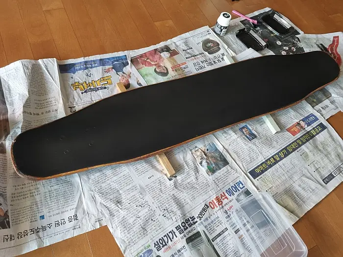 처음 가져올 때 여분의 롱보드는 외관만 보면 썩 좋은 상태는 아니었습니다. 스티커자국도 많고 여기저기 까이고 부서진곳도 있었고요, 무엇보다 상판 도색이 다 벗겨지고 해서 영 지저분한 모습이었습니다.
