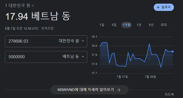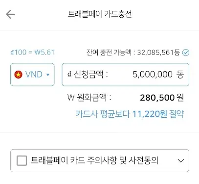 실제 환율로 500만동을 원화로 해보면 278,700 원이라는 것을 알 수 있습니다. 살때, 팔때 수수료가 붙는 것을 고려해 보면 트레블 월렛에서 280,500 이라는 수수료를 포함한 금액이 매우 저렴한 것을 알 수 있습니다.