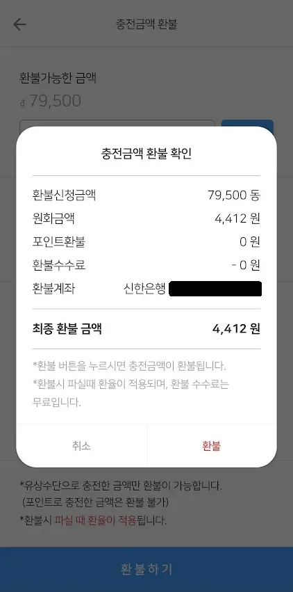 끝으로 여행을 마치고 79,500 동이 트레블월렛 카드에 남았는데요. 남은 동은 다시 원화로 환불할 수 있어 해보니 4,412원으로 환불이 되었습니다. 팔때 환율로 바로 환불이 된 것인데요. 여행에서 남은 금액을 거의 손해 없이 환불 받을 수 있는점도 아주 좋은것 같습니다.