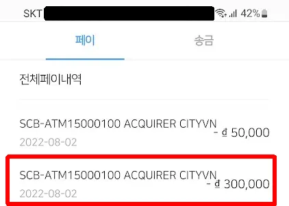 이번 인출에는 수수료 없이 30만동이 인출된 것을 확인할 수 있습니다