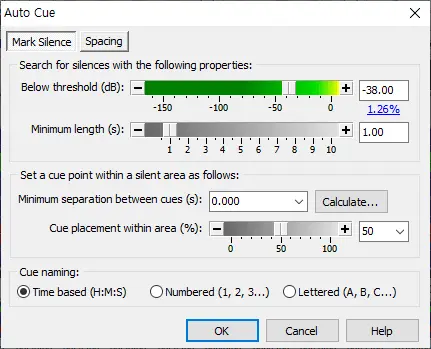 위에 두개의 슬라이더를 조절하여 무음 구간을 판단하기 위한 속성을 조절합니다. 위쪽 슬라이더는 사운드의 크기가 일정 수준 이하이면 무음 구간으로 판단하는 거고요, 아래쪽 슬라이더는 해당 무음구간이 지정한 시간 이상 지속되면 해당 위치에 Cue 를 추가하는 것이죠.