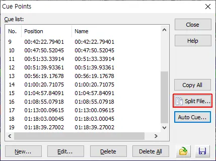 어쨌든 이렇게 자동으로 큐가 추가된 리스트를 개별의 음원으로 저장하는 방법은 위에 빨간 네모박스가 표시된 Split File 버튼을 눌러주면 됩니다.