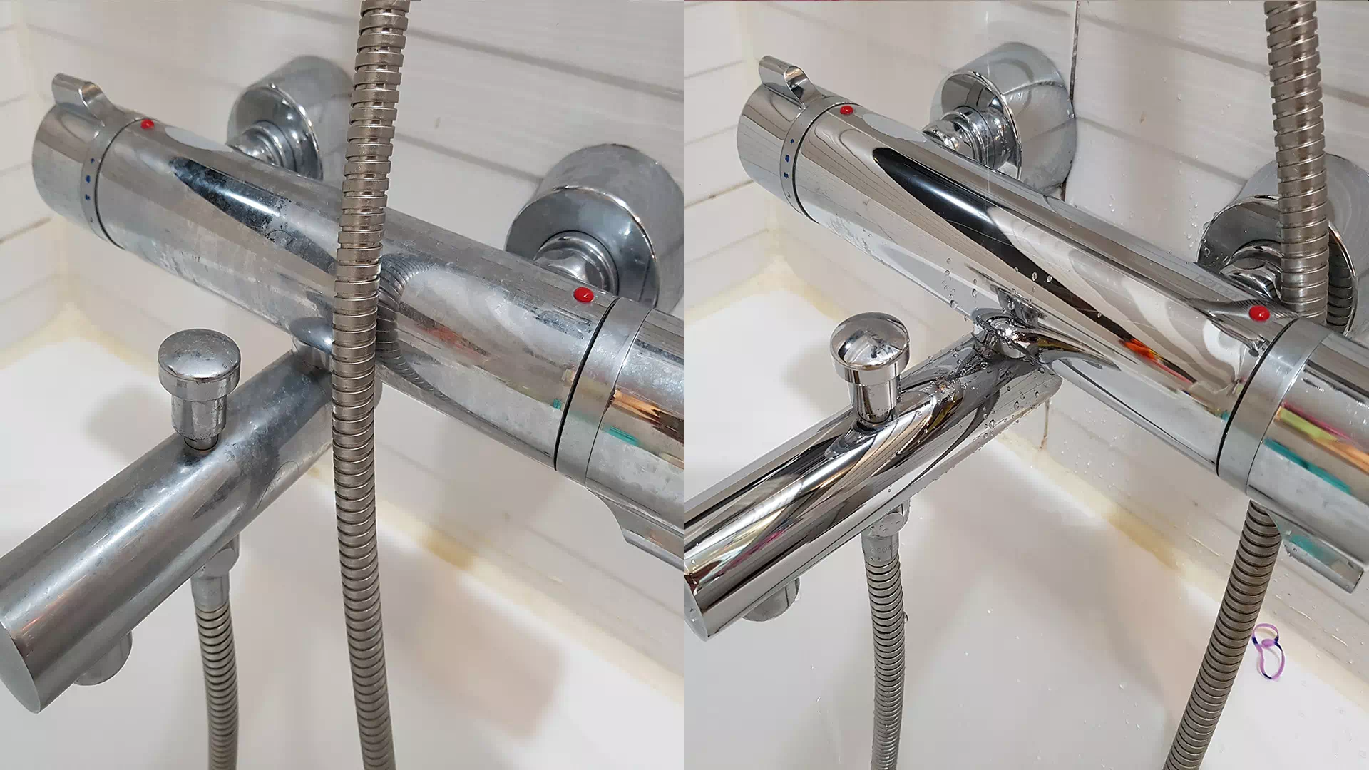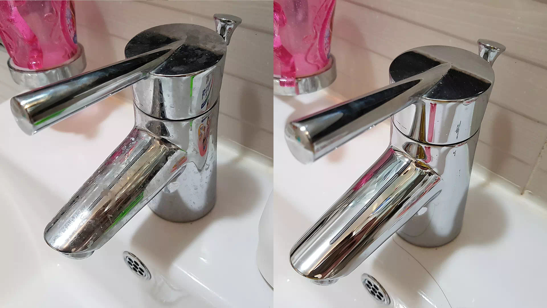 어쨌든 며칠간 청소를 하지 않아 지저분해진 욕실 수전의 닦기 전과 닦은 후의 모습입니다. 이번 포스팅을 위하여 며칠 청소하지 않고 방치를 해 두었더랬죠.