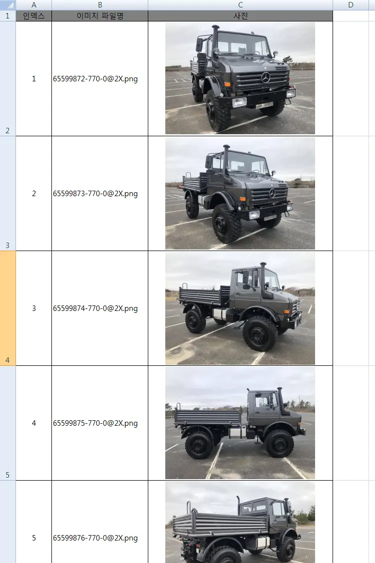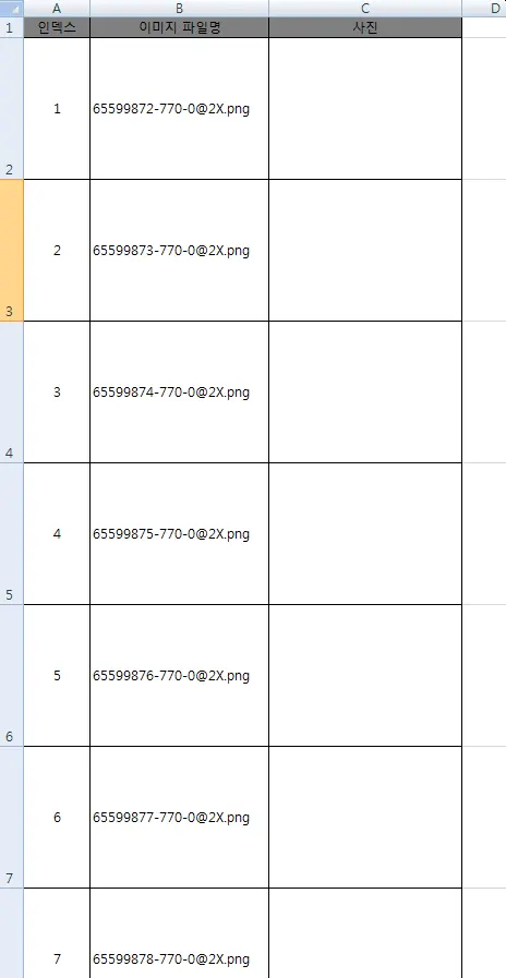 먼저 이미지 이름 (경로 포함 또는 경로는 별도로 설정) 이 있는 셀이 연속으로 있어야 겠습니다.