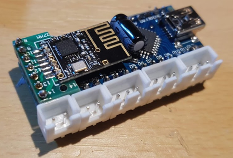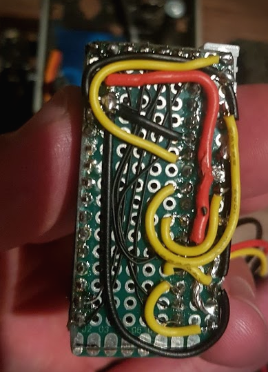 사진에 제일 위층에 얹어진 검정색 PCB 보드가 NRF24L01 보드이다. 뒤쪽에 초록색으로 보여지는 보드는 작업의 편의 성을 위하여 붙인 것으로 원래는 14 pin Attiny84 smd 타입을 일반 만능기판에 연결할 수 있도록 사용하는 아답터 보드인데 이것을 반을 자르면 7핀을 이용하는 NRF24L01 보드의 확장용 보드로 사용이 가능할 것 같아 납땜하여 붙여서 사용해보았고 아주 만족스러운 호환성을 보여주었다.