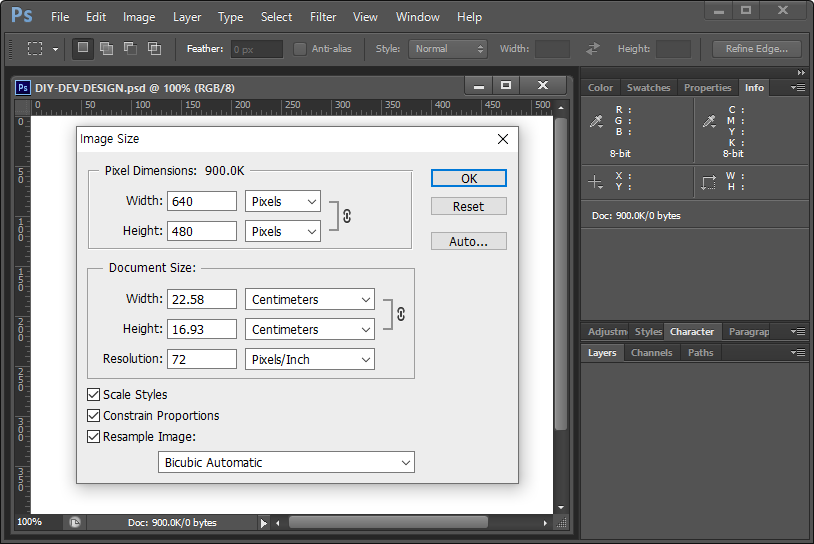 그리고 ResizeImaze 뒤에 Cells(2,1).value 는 알겠는데 그 뒤에 오는 72 와 4 라는 숫자는 뭘까요?? 각각의 값은 위 이미지에서 볼 수있는데요. 바로 리사이즈시 사용하는 Resolution 정보와 아래 resample 옵션인 Bicubic 에 해당하는 옵션입니다.