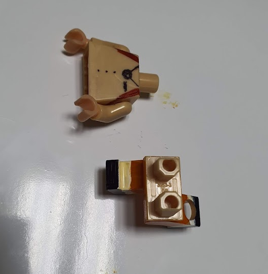 락카신너를 화장솜에 뭍힌 후 문질러서 미니피규어의 몸통에 프린트 되어 있는 무늬를 일단 지워 줍니다.
