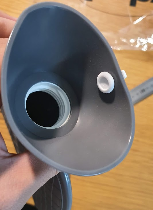물을 따르는 입구는 아래와 같이 생겼습니다. 음료병 뚜껑이 거꾸로 된것 처럼 마개가 들어가는 구멍이 있고요. 옆에 하얀 동그란 것은 고리 입니다. 매달아 놓고 보관할 수 있도록 고리가 장착이 되어 있습니다.